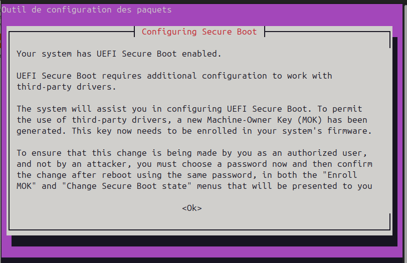 Si c'est le cas, cela indique la présence du Secure Boot sur votre ordinateur. Pour que VirtualBox fonctionne correctement, une clé de sécurité a été générée par l'installation.